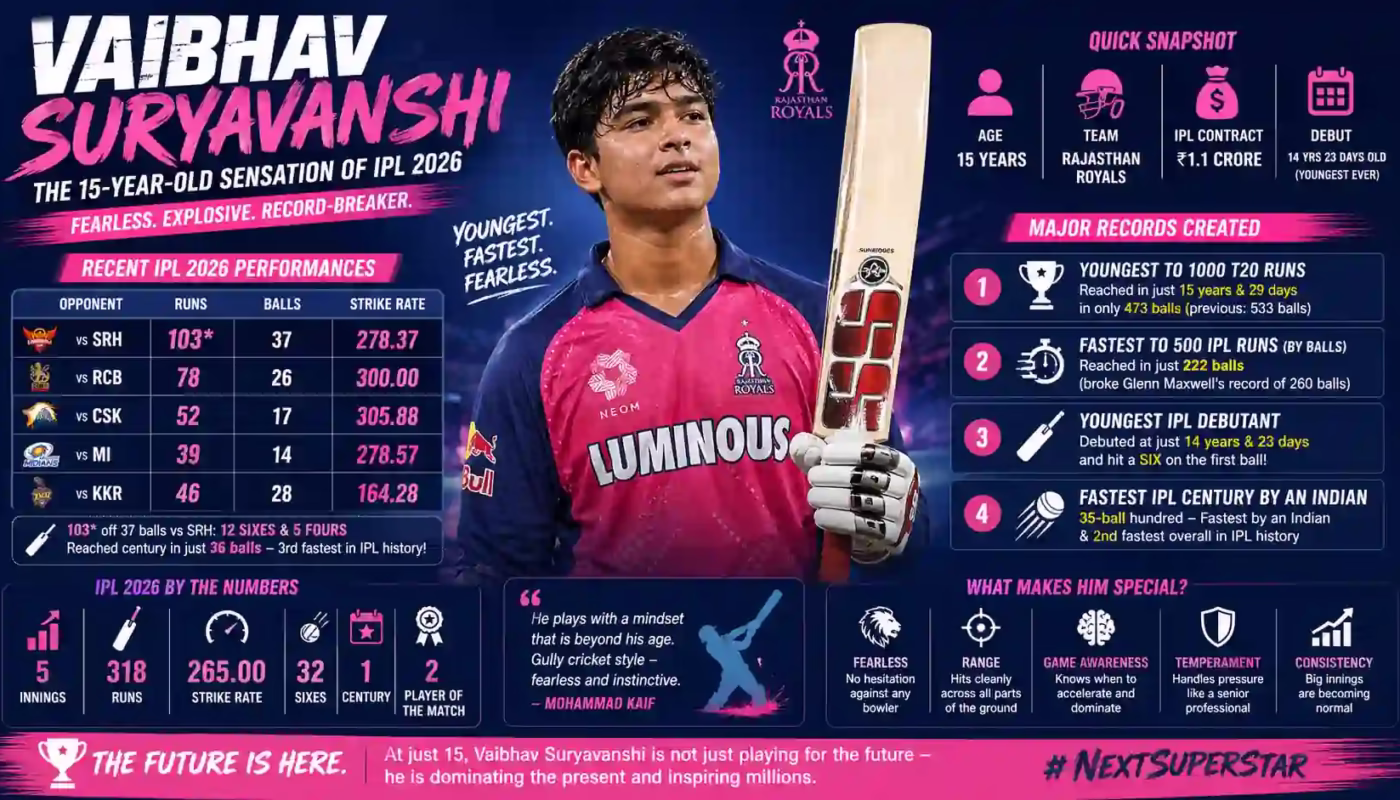 He is already a match-winner, a record-breaker, and one of the most dangerous batters in IPL 2026. At 15, he is not playing for the future — he is dominating the present.
